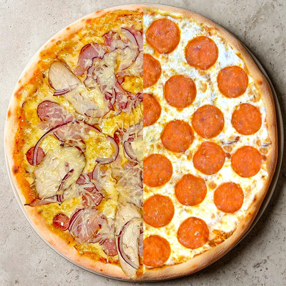 охотничьи колбаски, копченая курица, бекон, фирменный красный соус, красный лук, моцарелла, пармезан / пепперони, моцарелла, фирменный красный соус