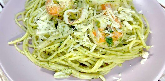 Паста Песто с креветками и кальмаром