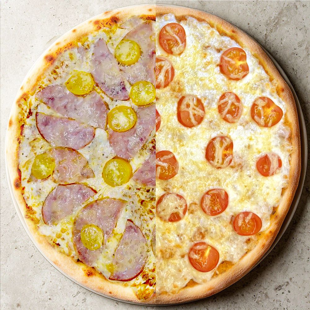 ветчина, черри, моцарелла, пармезан, фирменный красный соус / моцарелла, черри, пармезан, фирменный красный соус