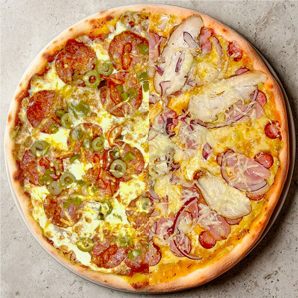 пепперони, халапеньо, оливки, перец чили, моцарелла, фирменный красный соус, пармезан / охотничьи колбаски, копченая курица, бекон, фирменный красный соус, красный лук, моцарелла, пармезан