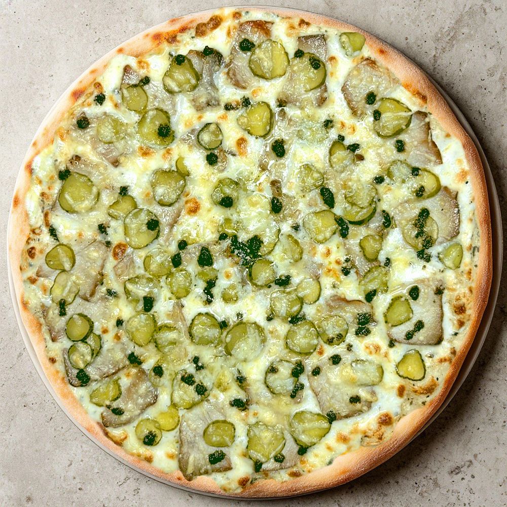 копченая свинина, корнишоны, моцарелла, пармезан, фирменный сливочный соус, соус песто