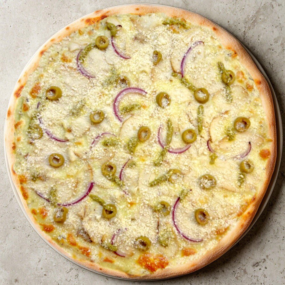 копченая курица, оливки, красный лук, моцарелла, пармезан, фирменный сливочный соус, соус песто