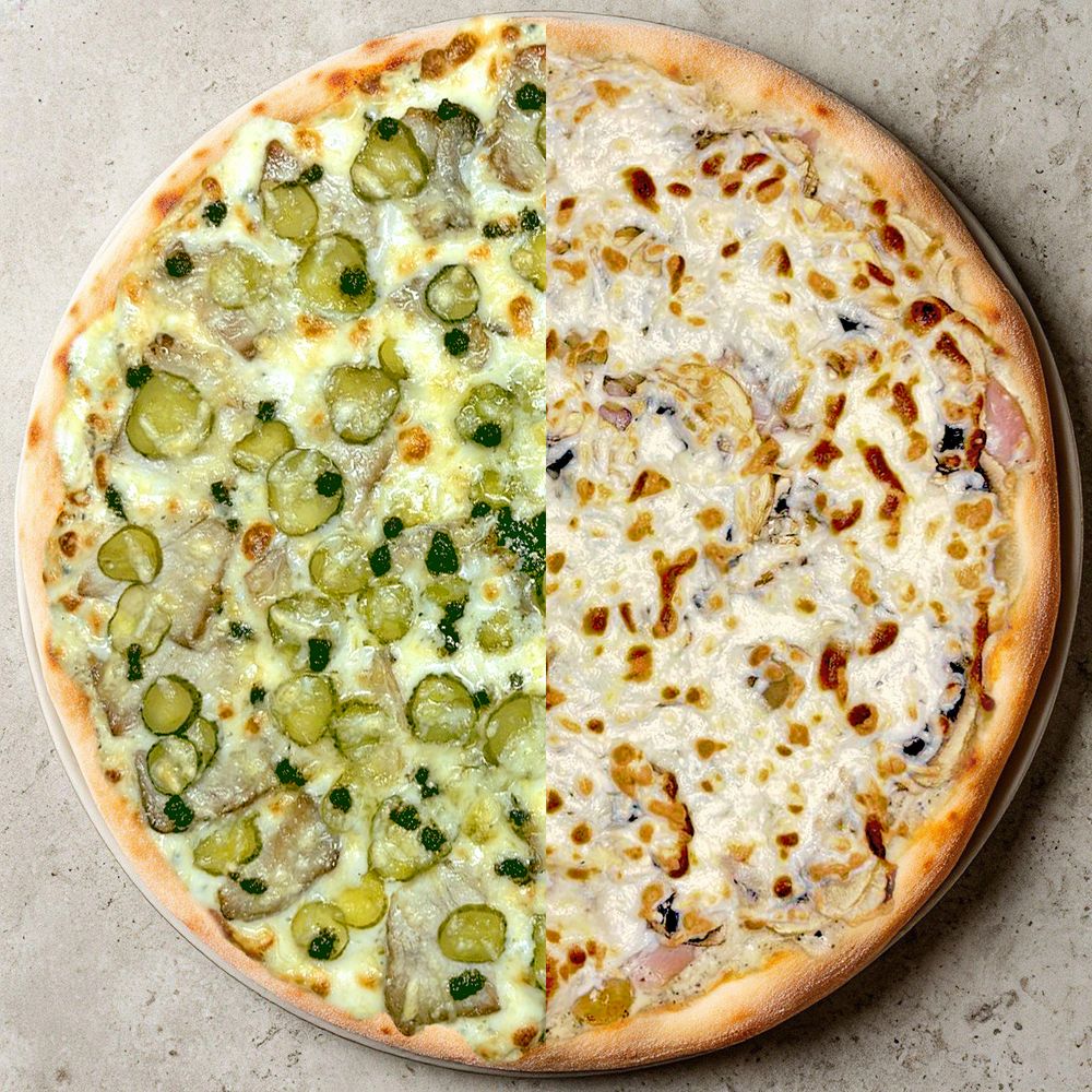копченая свинина, корнишоны, моцарелла, пармезан, фирменный сливочный соус, соус песто / ветчина, шампиньоны, моцарелла, фирменный сливочный соус