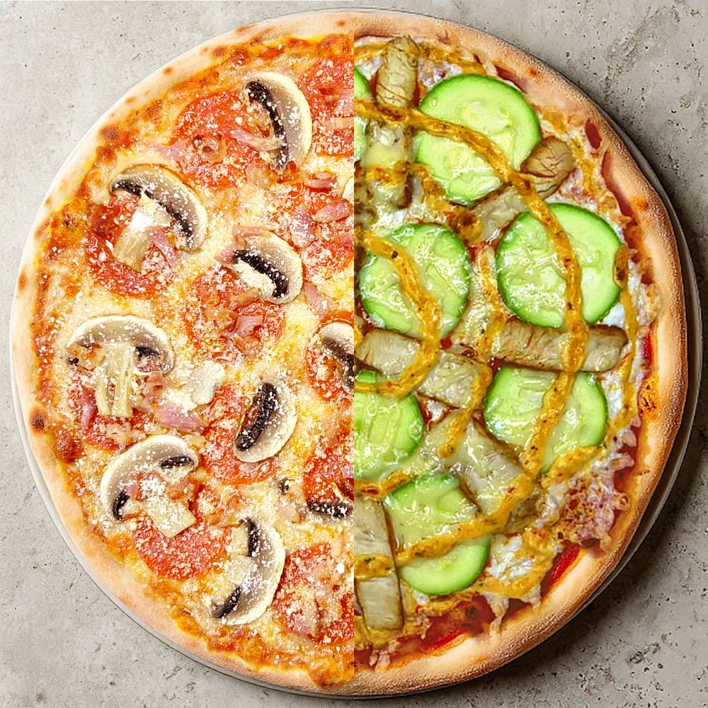 пепперони, шампиньоны, бекон, моцарелла, фирменный красный соус, пармезан, соус сладкий чили / индейка, цукини, моцарелла, фирменный красный соус, пармезан, соус 1000 островов