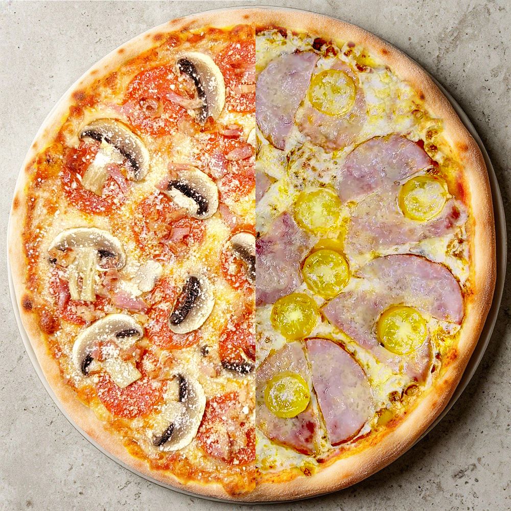 пепперони, шампиньоны, бекон, моцарелла, фирменный красный соус, пармезан, соус сладкий чили / ветчина, черри, моцарелла, пармезан, фирменный красный соус