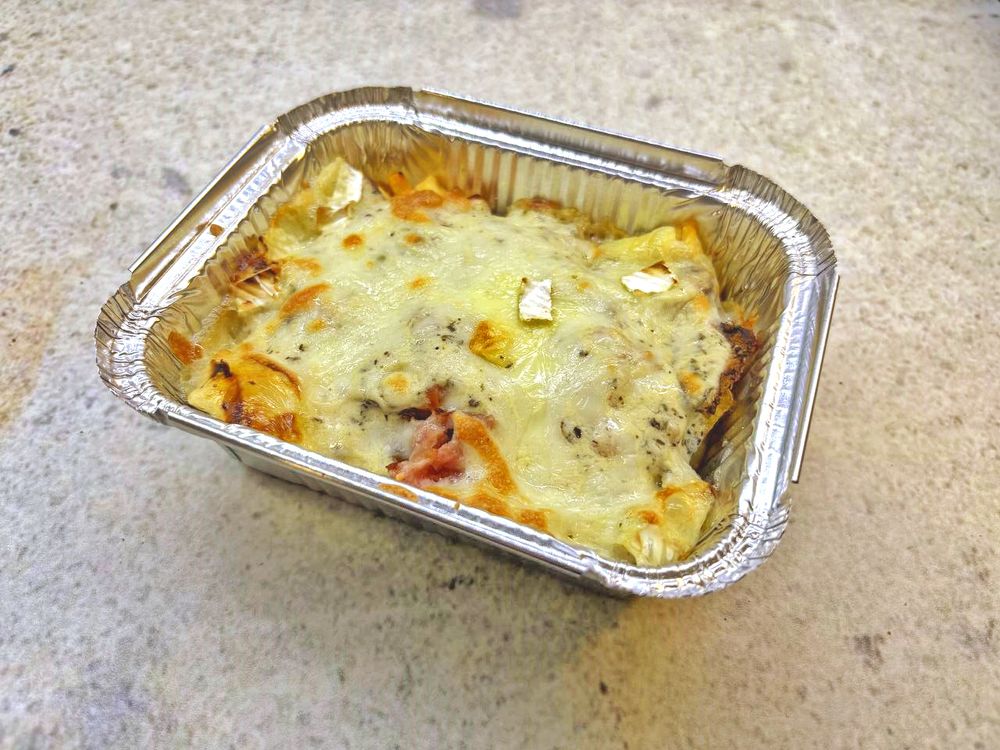 картошка фри, запечённая в печи в нежном сливочном соусе и двумя видами сыра — моцареллой и камамбером, с добавлением мясного топинга