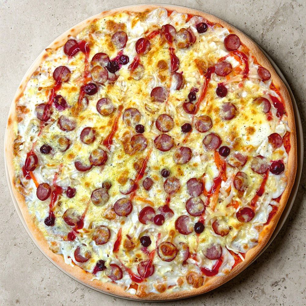 Вольная, разудалая, наша! Фирменный томатный соус встречается с хрустящей квашеной капустой, дымными охотничьими колбасками и кислинкой дикой клюквы. Всё это великолепие под шапкой костромской Гауды и финальным аккордом — сладковатым брусничным соусом и чёрной солью. Щедро, сочно, с костромским характером!