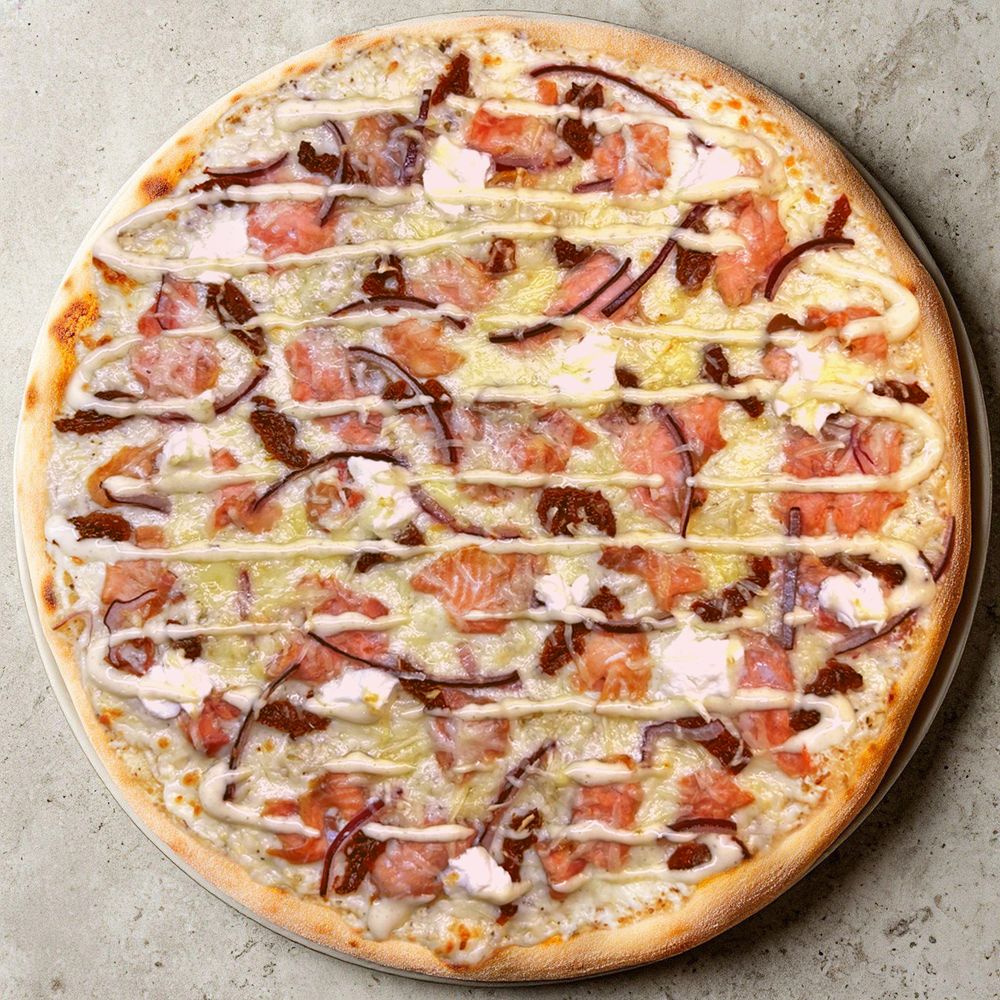 лосось с/с, вяленые томаты, рикотта, красный лук, моцарелла, пармезан, фирменный сливочный соус, соус цезарь
